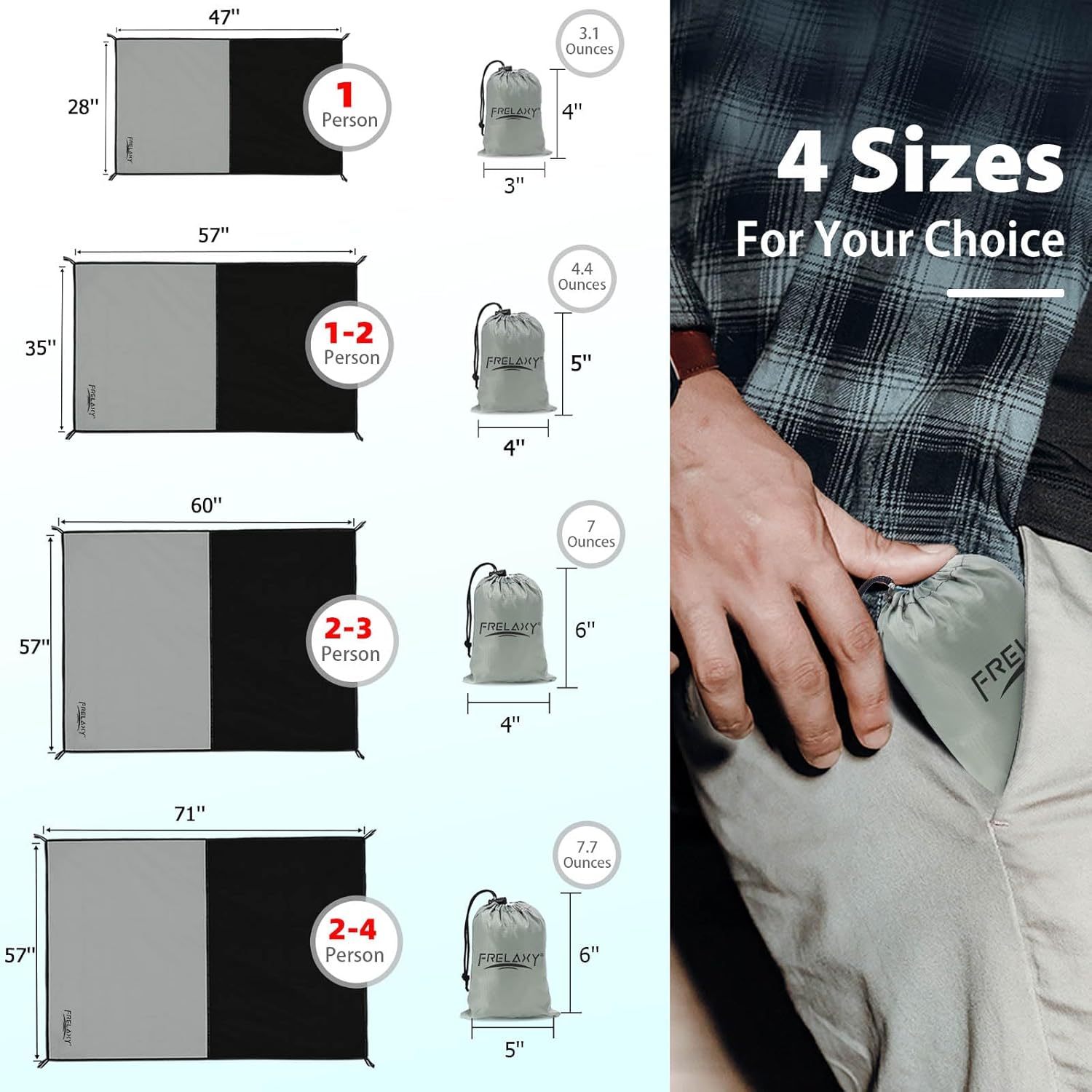 - Always-Ready Pocket Blanket: Size - 57'' x 60'', weighing just 7 ounces, and folding down to a mere 4''x 6''. Our blanket fits into your pocket or backpack without adding any noticeable weight or bulk, so you can always be ready for impromptu adventures.