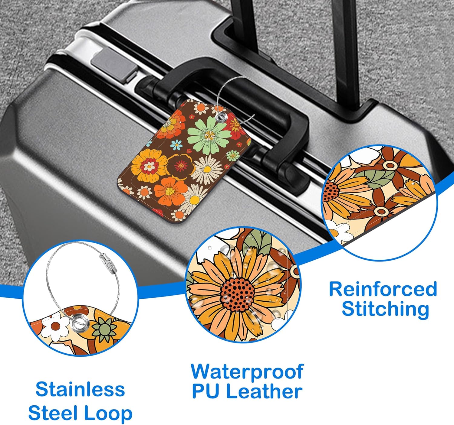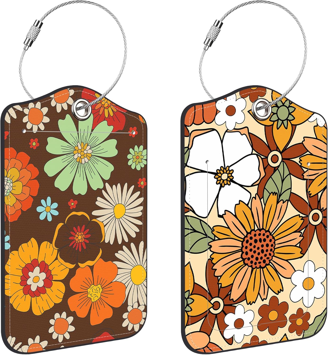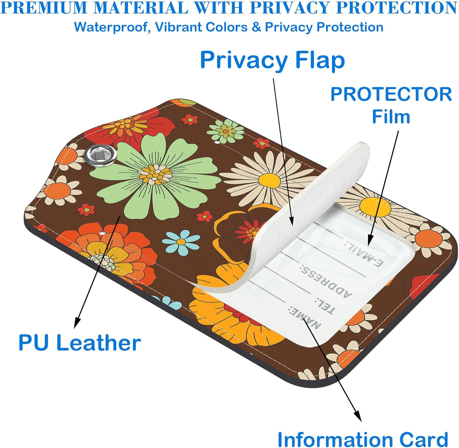 70s Retro Floral Luggage Tags for Suitcases Leather Travel Tags for Luggage ID Label with Privacy Cover and Stainless Steel Loop for Men Women Suitcase Backpack, Set of 2