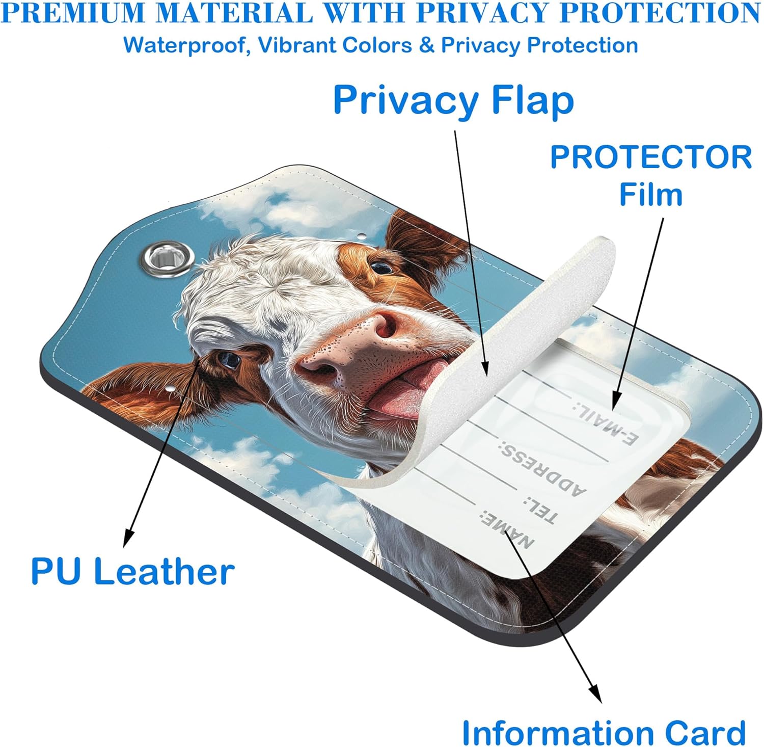 Cute Cow Sticking Out Tongue Luggage Tags for Suitcases Leather Travel Tags for Luggage ID Label with Privacy Cover and Stainless Steel Loop for Men Women Suitcase Backpack, Set of 2