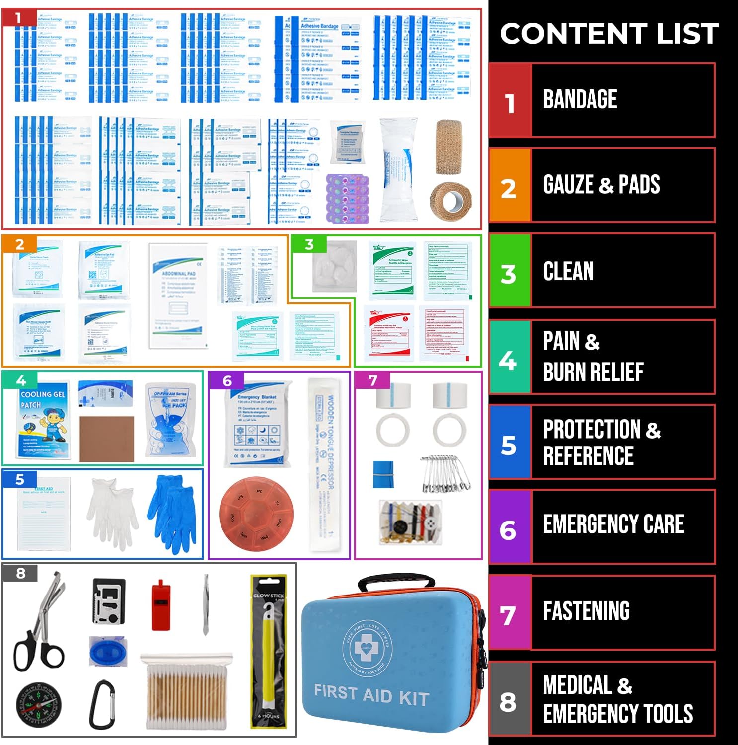 - Professional Emergency Kit: Comprehensive collection of 410 professional-grade supplies including wound care bandages, adhesive plasters, surgical scissors, gloves, ice pack, emergency poncho, and essential trauma supplies. All components are 100% latex-free.