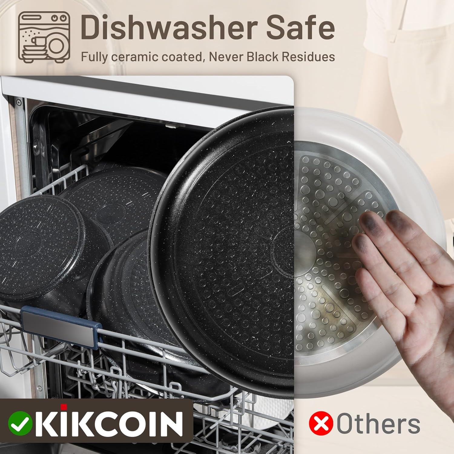 - 【BUSY KITCHEN SAVIOR】For the messy busy kitchen, our ceramic pans set are lifesaver, you won’t spend 10 minutes scrubbing burnt gunk; just rinse with soapy warm water, wipe with a towel, these cooking pots would keep brand new - Oven safe up to 840°F -Dishwasher safe, and Never get black residues issues.