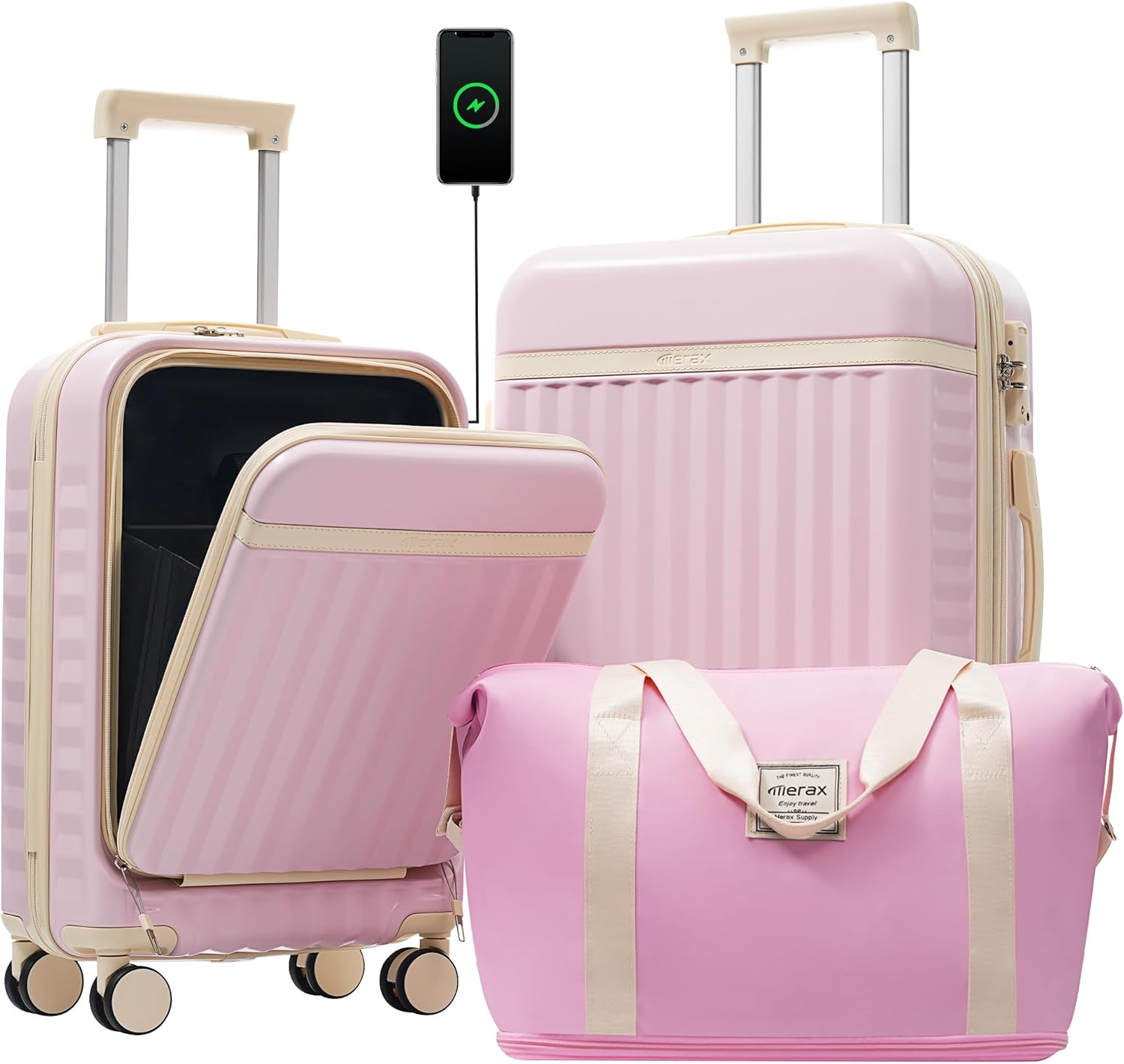 Merax Luggage Sets Front Opening, 2 Piece Hardshell Suitcase with Spinner Wheels and Bags,Lightweight Carry on Luggage with USB Port,20+24,Pink