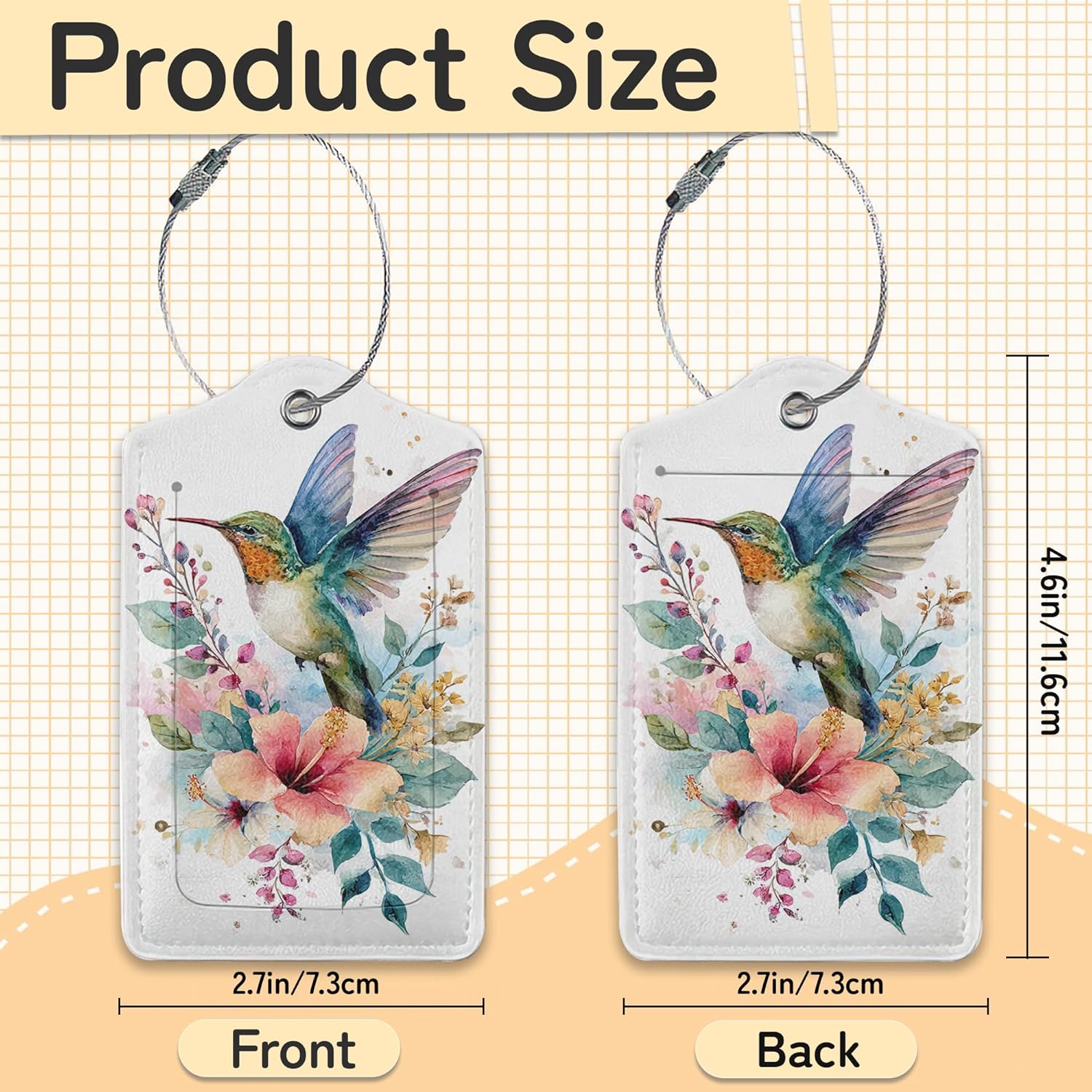Hummingbird Flowers 3 Pack Luggage Tags for Suitcases, Cute Leather Name Tag with Privacy Cover with Stainless Steel Loops, Travel ID Bag Tags for Women Men