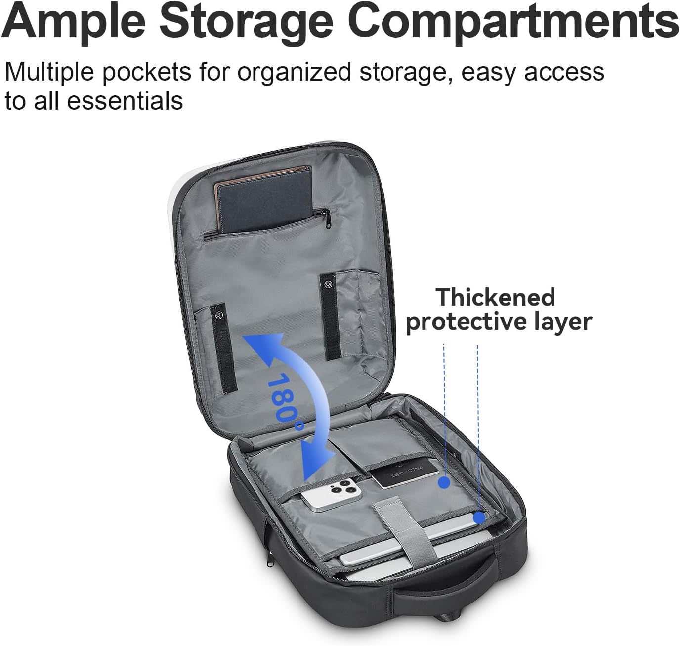 - 【MULTI-POCKET FOR ORGANIZED STORAGE】With its thoughtfully organized interior, this backpack features multiple storage compartments designed to securely hold a wide range of essentials. The carry on backpack can comfortably fit laptops up to 16 inches, as well as an iPad, folders, pens, books, wallets, tablets, power banks, and more. The spacious layout ensures everything has its place, making item storage neat and easily accessible. The backpack opens a full 180° for easy retrieval.