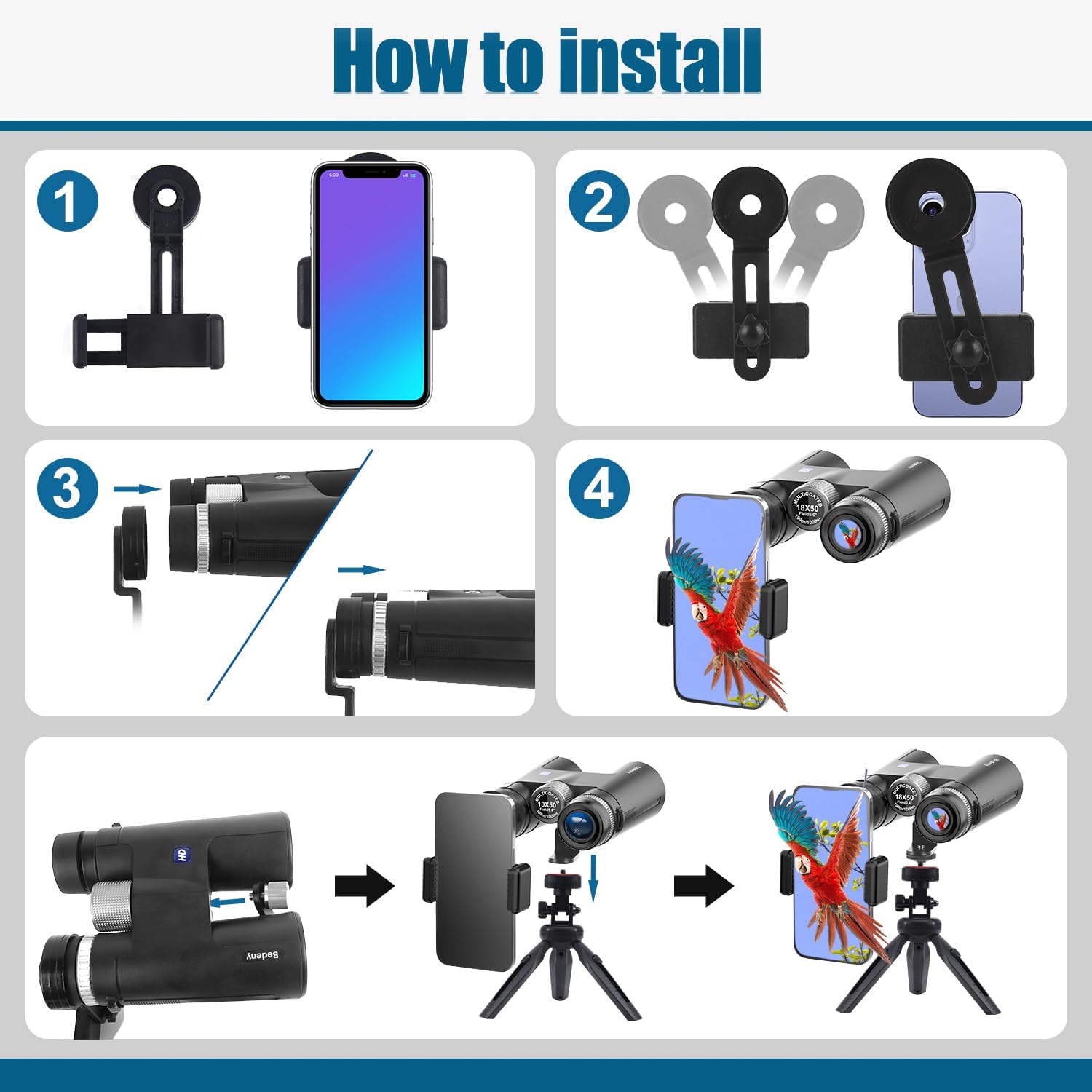 - Upgraded Phone Adapter, Tripod and Tripod Adapter: With an upgraded phone adapter, it enables you to take ultra-clear long-distance photos with just one click while observing. With an tripod and tripod adapter that can be adjusted in length and rotated at multiple angles, allowing you to easily lock in different viewing heights and making long-term observations more effortless.