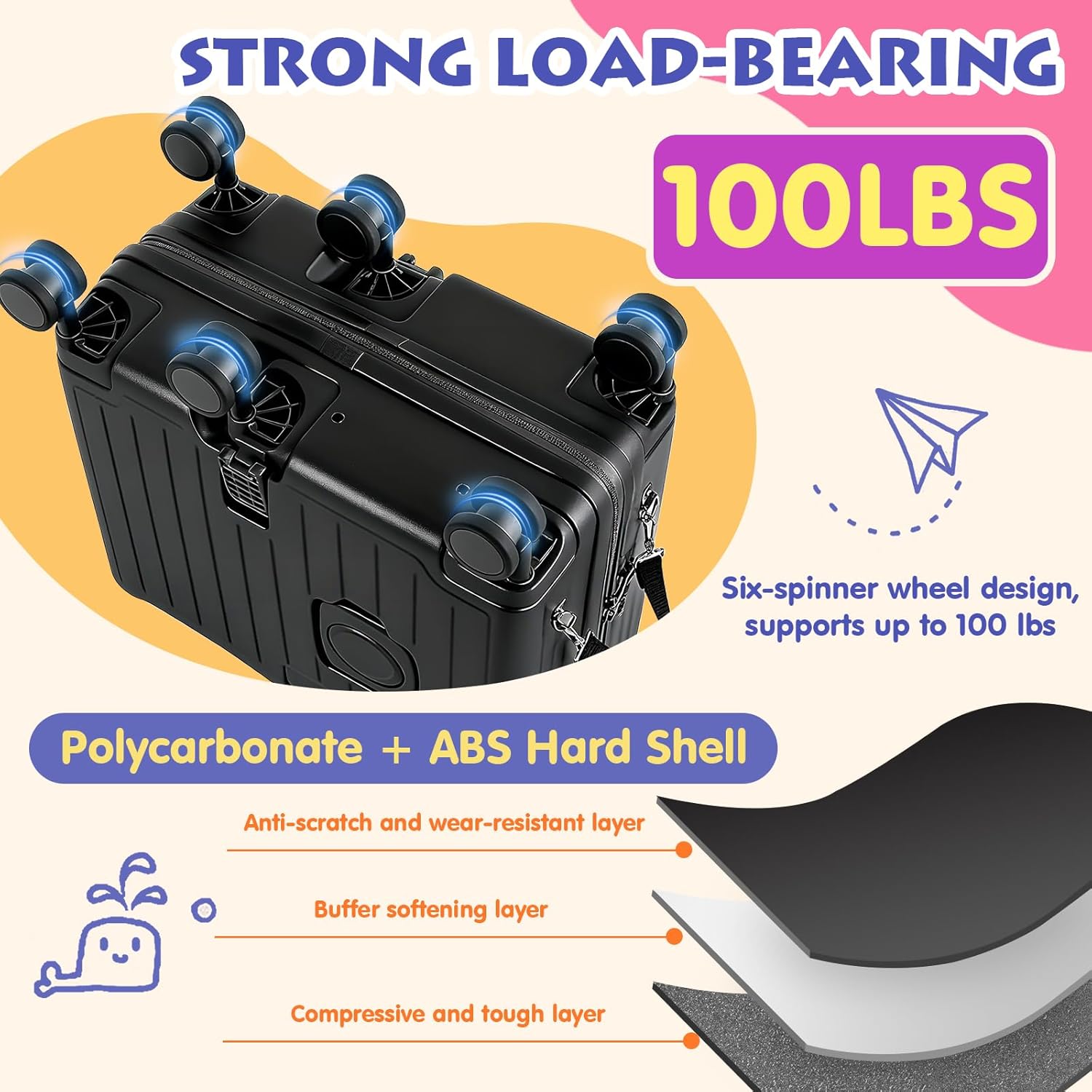 Kids Ride-On Luggage, 20" Hardshell Carry-On Suitcase with 6 Spinner Wheels, Foldable Pedal, Hidden Cup Holder & Combination Lock for Toddlers & Children (Black, 20-inch)