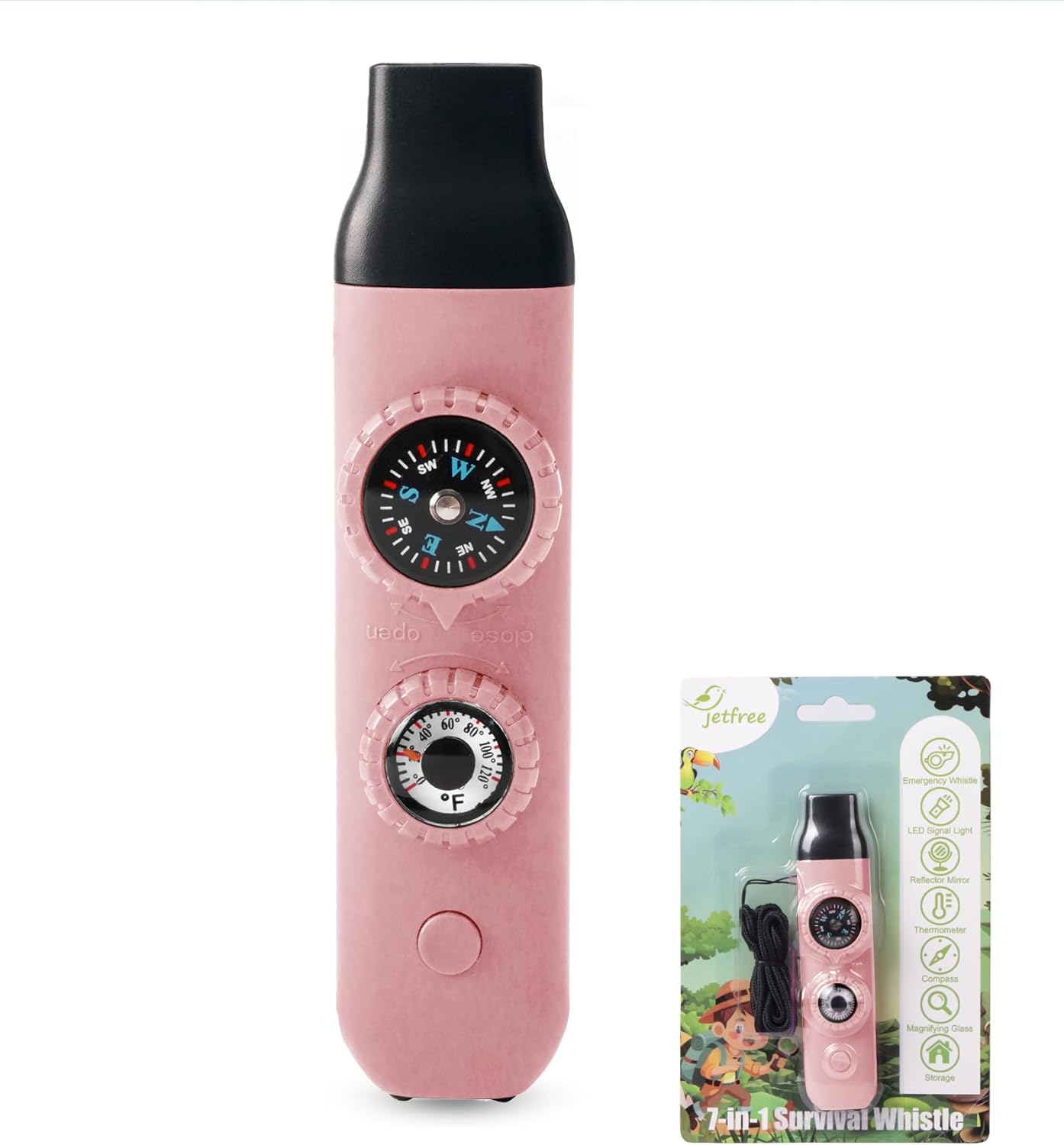 • 1. Multifunctional whistle includes: Emergency whistle + precision compass + temperature-sensitive thermometer + LED signal light + magnifying glass + 360° reflector + sealed info capsule