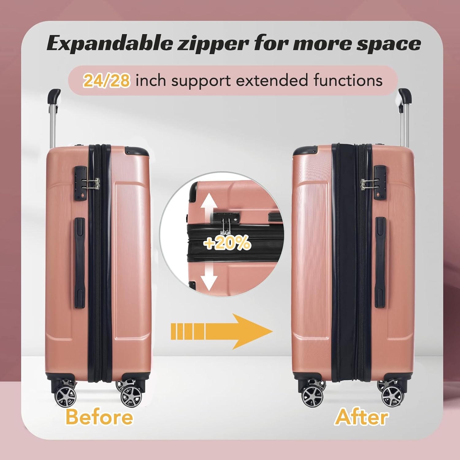 - Expandable Luggage: The 28inch suitcase expands by 20% to provide extra packing space, making it easy to store additional clothes, souvenirs, or travel essentials. When needed, simply unzip the expansion zipper for extra room.