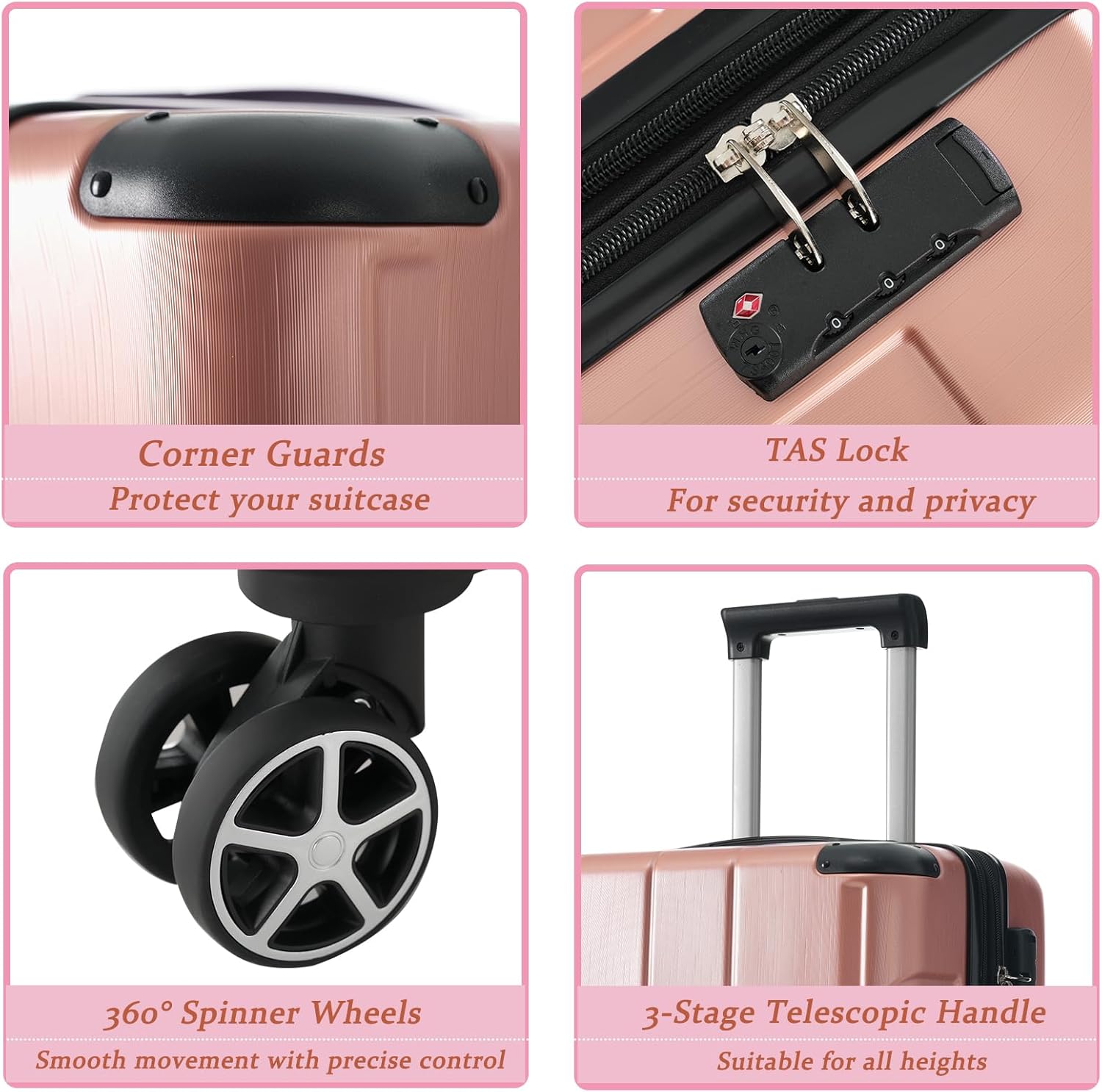 - Ergonomic Design: 3-stage telescopic handle makes it easy for travelers of all sizes to adjust and operate. The 24" and 28" suitcases also feature ergonomic TPE handles with soft-touch materials for comfortable lifting and carrying.
