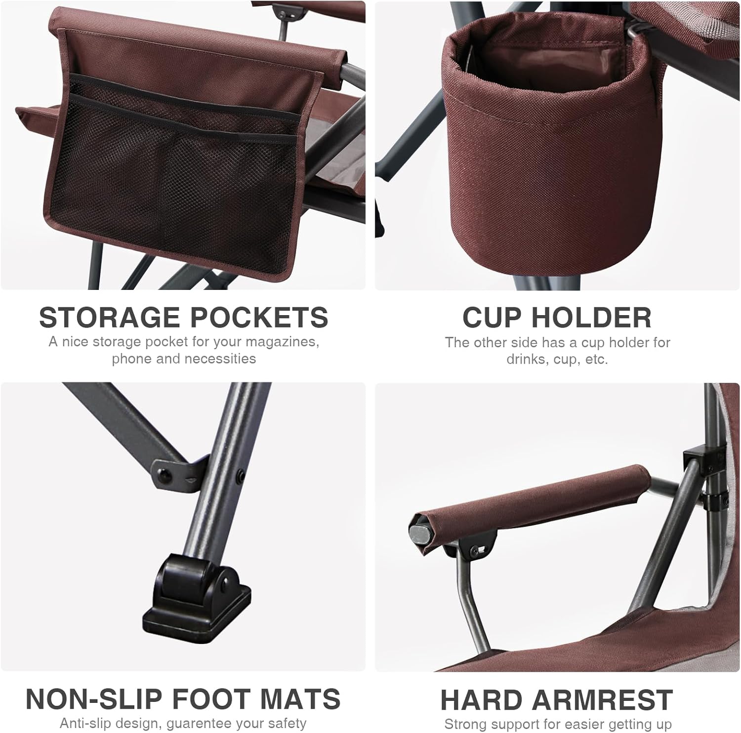 - 【HEAVY DUTY COMFORT】: Our xl camping chair is made with a heavy duty steel frame and can support up to 500lbs. Equipped with hard armrests for getting up easily.